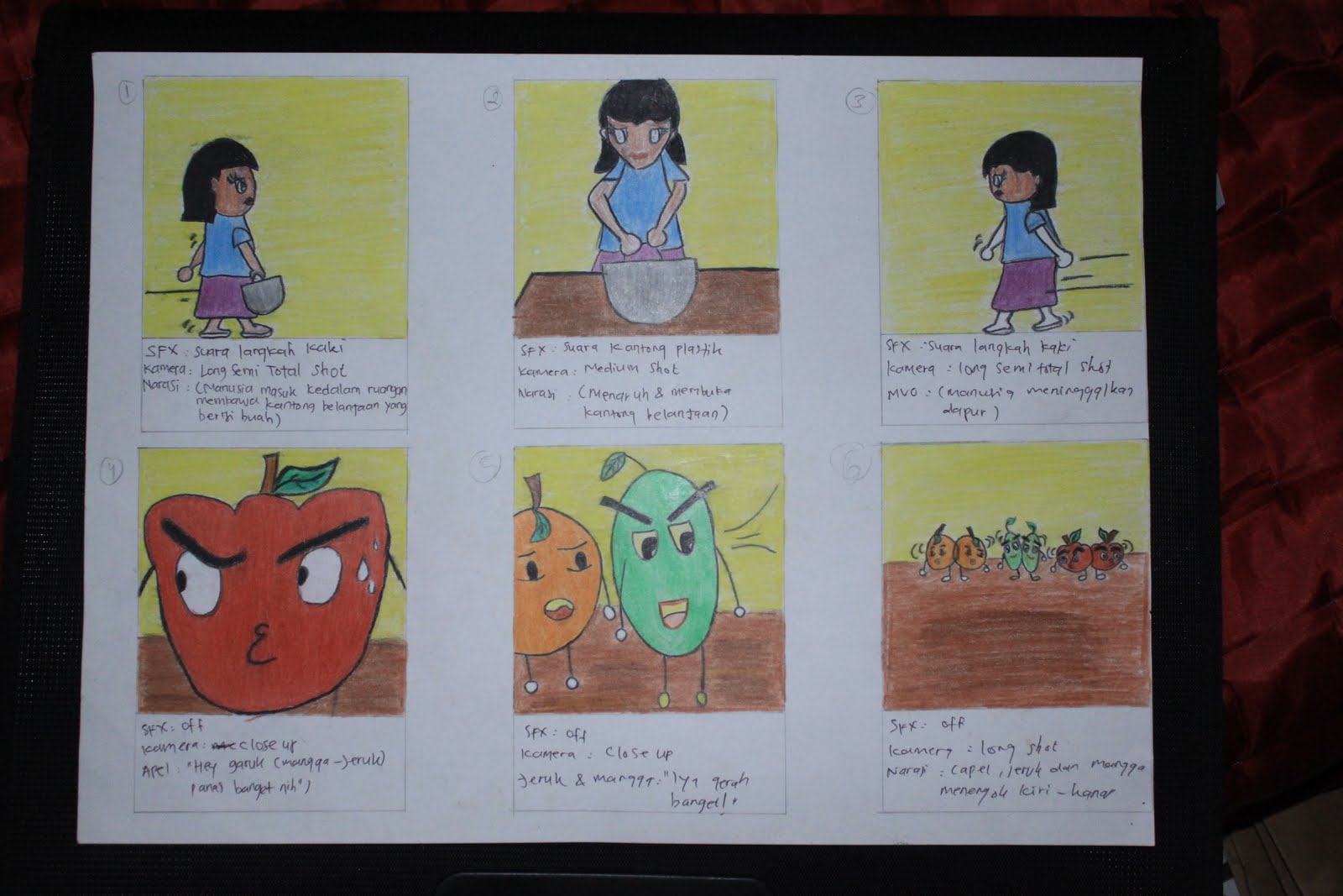 Halo. Ini adalah tugas matakuliah Animasi 2 Dimensi I. Dan tugas adalah... jengrejengjeng... membuat storyboard cerita. Di storyboard gue ada 18 Frame. Nah, ini digambar kemudian diwarnai, tekniknya full manual. Ini tugas kelompok gue dengan Anggia.
